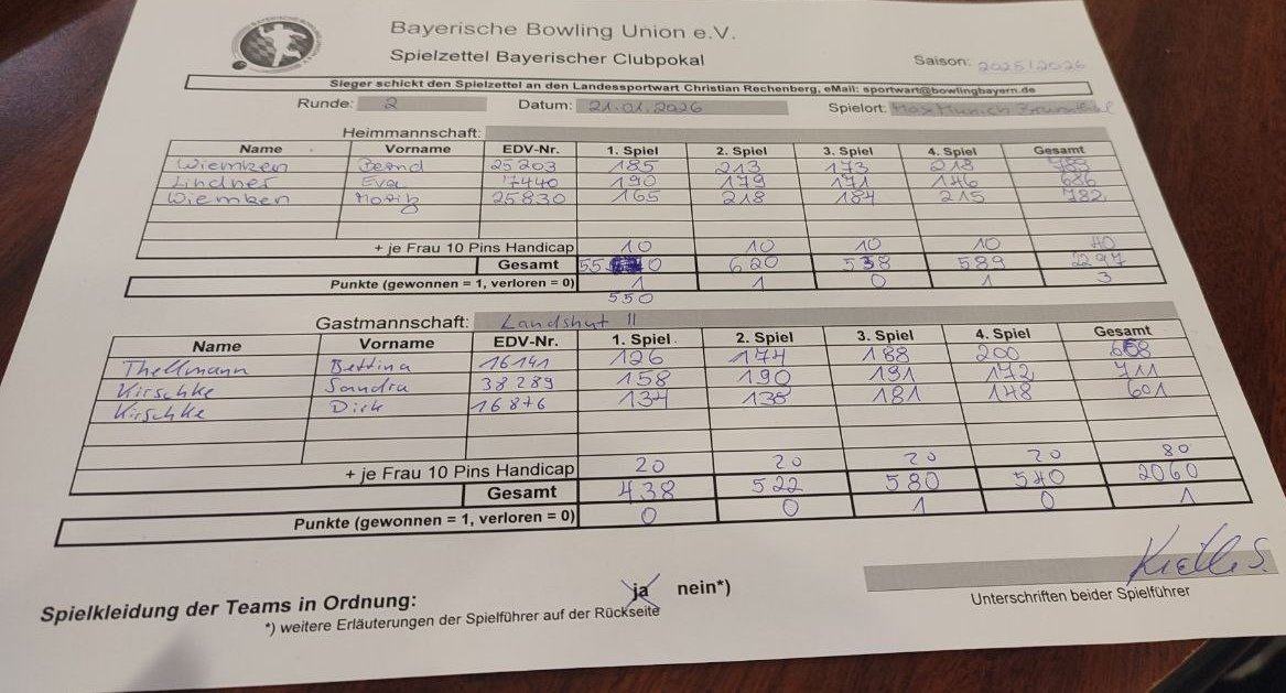 Es konnte zwar ein Spiel mit 42 Pins Vorsprung gewonnen werden, am Ende standen aber 2060 : 2297 Pins und 1 : 3 Punkte auf dem Zettel. Ob das für ein Weiterkommen als Lucky Looser reicht? Warten wir das Ende der Runde ab und drücken dem Team so lange die Daumen.